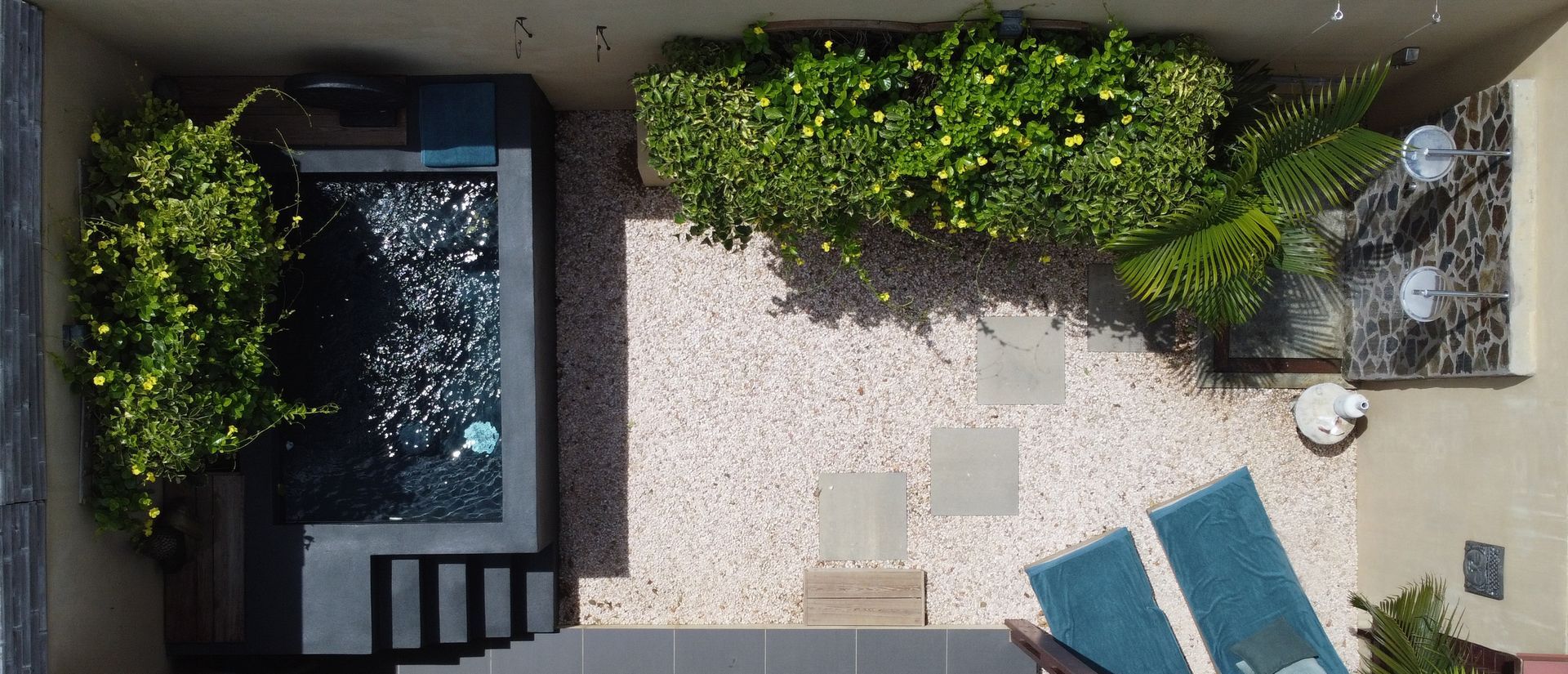 De Superior Cottage met dompelbad, gelegen aan de rustige achterzijde van het resort, biedt volledige privacy en comfort voor twee personen. Deze oase is omgeven door weelderige groene tuinen en beschikt over diverse loungeplekken, een barbecue en een magnesium dompelbad, bekend om zijn helende en stressverlichtende werking. In de cottage vindt u een kingsize bed of twee eenpersoonsbedden, een eethoek en een volledig uitgeruste keuken met een Nespresso-apparaat. De woonkamer is tevens voorzien van airconditioning en een smart-tv met Chromecast voor een volledig gepersonaliseerde ervaring.